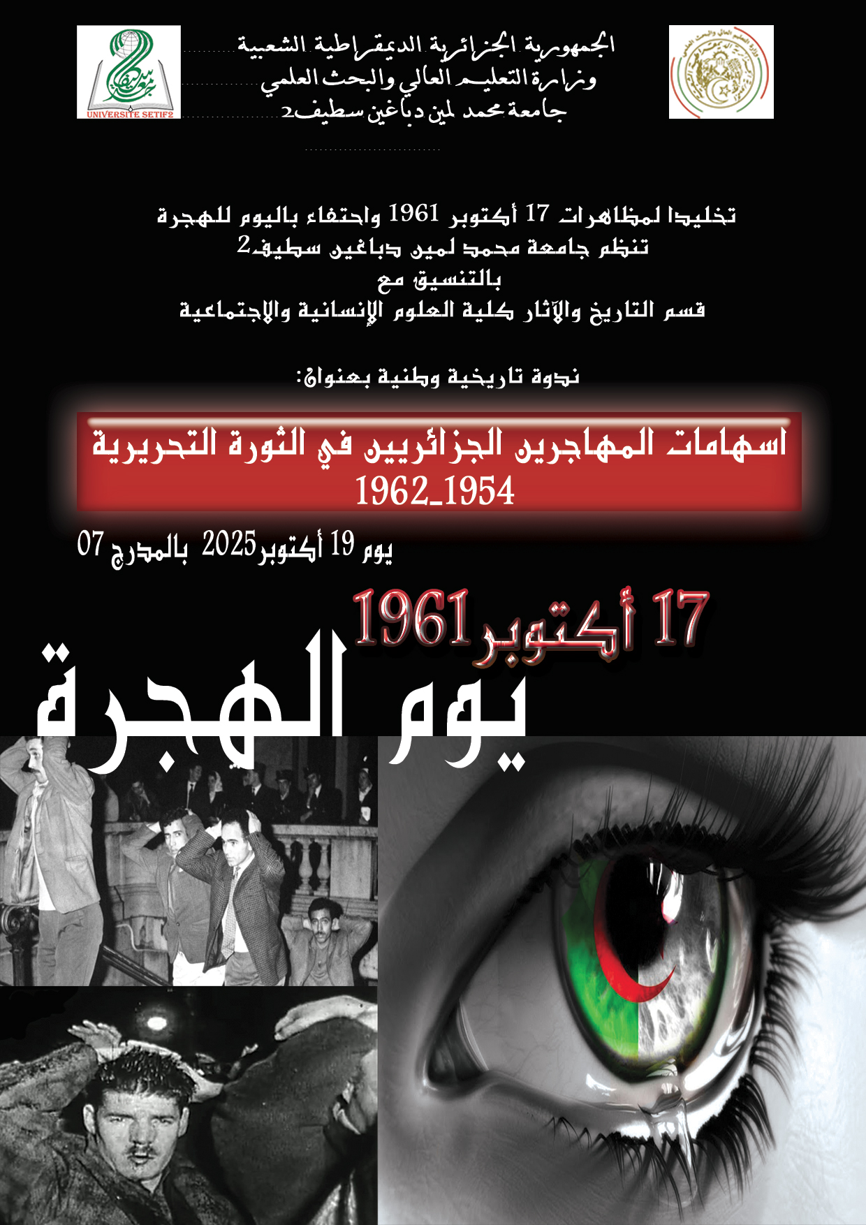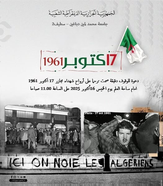 تخليدا لمظاهرات 17 أكتوبر 1961 واحتفاء باليوم الوطني للهجرة تنظم جامعة محمد لمين دباغين سيطف2 بالتنسيق مع قسم التاريخ والآثار كلية العلوم الإنسانية والاجتماعية ندوة تاريخية وطنية بعنوان: "اسهامات المهاجرين الجزائريين في الثورة التحريرية 1954-1962"، وذلك يوم 19 أكتوبر بالمدرج 07 على الساعة 09 صباحا.